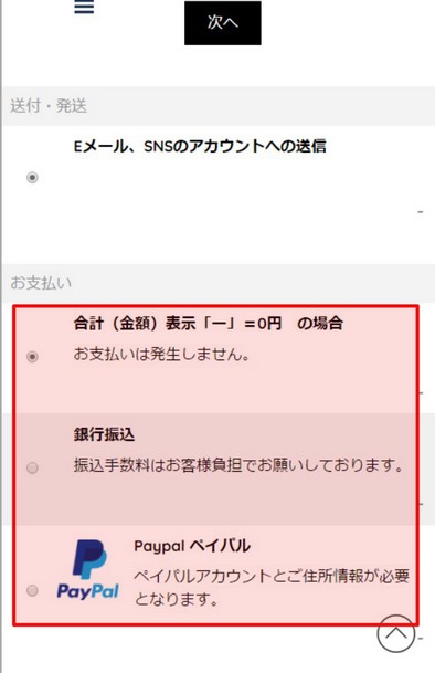 「合計(金額)表示「ー」=0円 の場合」、「銀行振込」、「Paypalペイパル」3つの中から選び「次へ」をタップして下さい。