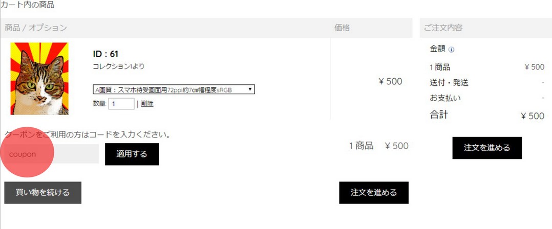 合計(金額)表示にクーポン適用(「ー」の場合は=0円)が反映されていることを確認して「注文を進める」をクリックして下さい。