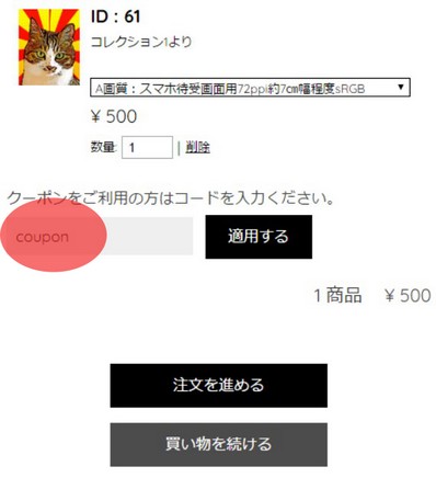 クーポンを利用する場合はクーポンコードを入力し「適用する」をクリックして下さい。