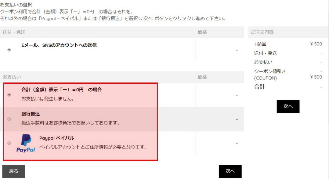 「合計(金額)表示「ー」=0円 の場合」、「銀行振込」、「Paypalペイパル」3つの中から選び「次へ」をクリックして下さい。