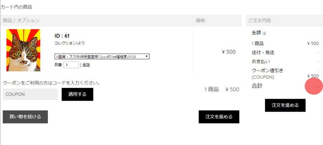 合計(金額)表示にクーポン適用(「ー」の場合は=0円)が反映されていることを確認して「注文を進める」をクリックして下さい。