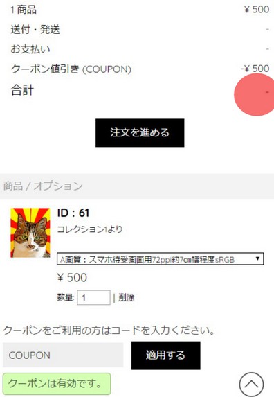 合計(金額)表示にクーポン適用(「ー」の場合は=0円)が反映されていることを確認して「注文を進める」をタップして下さい。